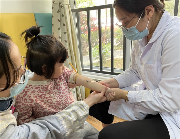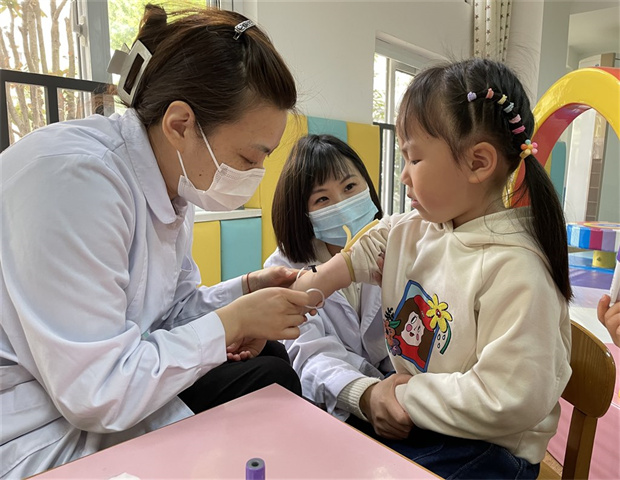早教室里太热闹啦!和蔼的“社区医生”专程来到幼儿园,认真地给宝宝们抽血检查。宝宝们挽起袖子,排队打针,大家都勇敢极了!
