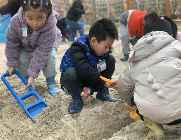 沙水区里不时传来孩子们的欢笑声,是什么让他们这么开心呢?只见他们把长长短短的管道拼接在一起,运用支架、拼插等方法搭建起玩水玩沙的方法......孩子们在自主探究和游戏中,不断探索,既锻炼精细动作,又学会了分工合作,沟通交际能力也提升了不少呢!