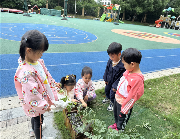 我们的西瓜经历了长叶、开花,现在终于结出了一个小西瓜,我们都开心极了!