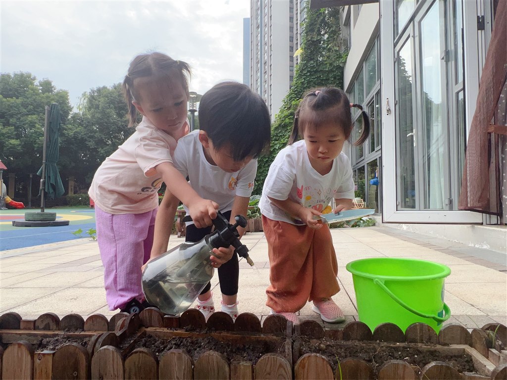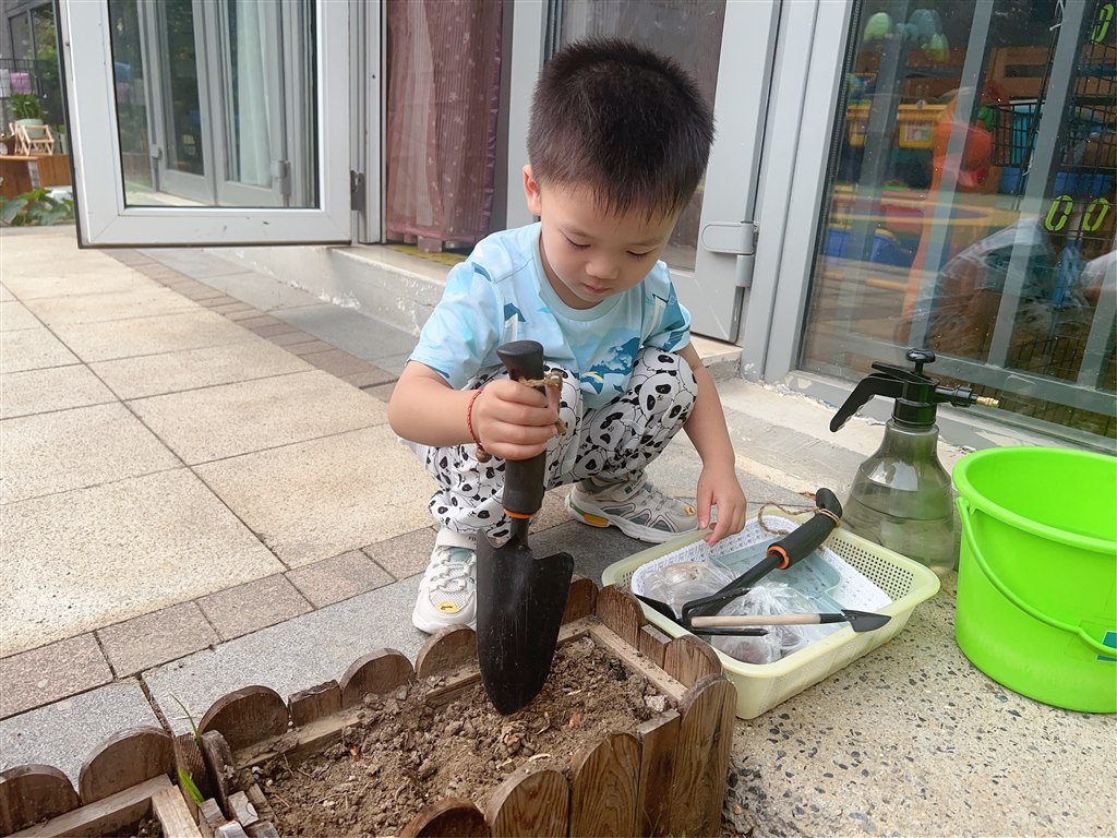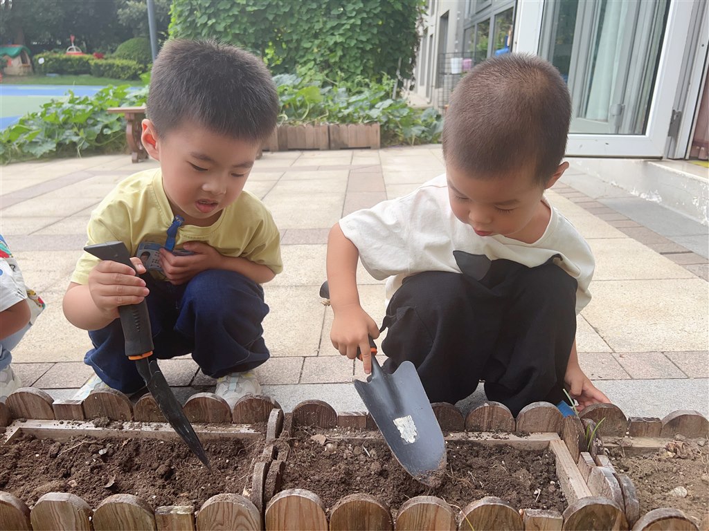 这是我们的种植地噢!一共有几个种植盆呢?一起数一数吧!种植物前,我们要先做些哪些准备工作?需要哪些工具呢?经过小朋友们一起讨论,我们需要先翻翻土,浇点水~需要铲子、水壶等。那就开始动手吧!
