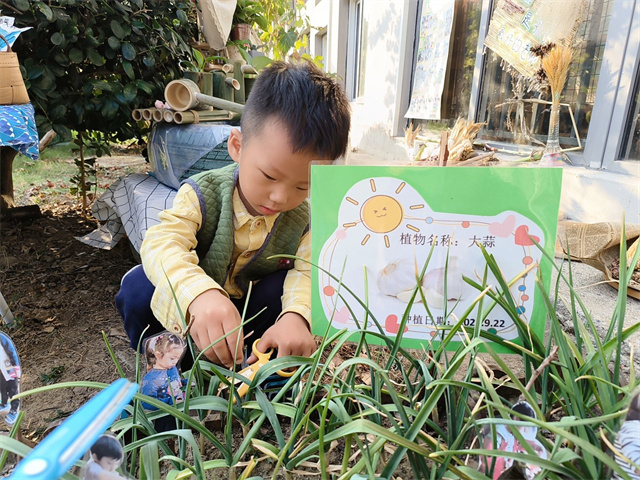 小朋友们在自然角浇水的时候,发现大蒜叶子变黄了,纷纷跑来问老师。“大蒜的叶子怎么黄了?”“这该怎么办呢?”他们发现了放在自然角的剪刀。于是他们拿起小剪刀来给大蒜修剪黄叶子啦!
