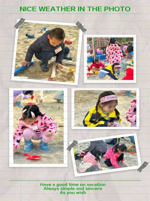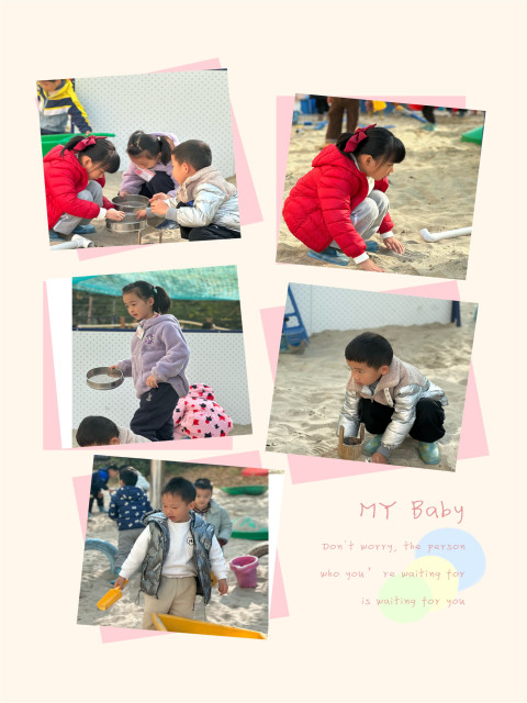 今天我们来到沙池区玩啦!套上雨靴走进沙池,挑选自己需要的工具,开始搭建自己的作品。你运水,我堆地基,大家分工明确,很快平平的沙池地上出现了一座座作品,沙池真有趣!