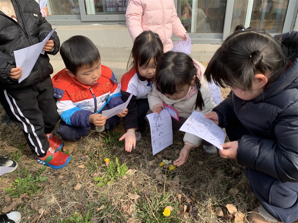 春来了,幼儿园的哪些花开了?带上我们的记录表一起开启寻花之旅。我找到了油菜花,我这有黄色的蒲公英,紫色的是什么花?郁金香开了一朵是紫色的。让我来数数它有几个花瓣。孩子们你一言我一语……春天在我们的眼睛里。