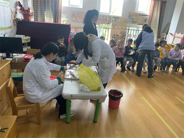 本次体检项目有心肺听诊、五官口腔检查、视力检查、抽血以及龋齿检查。来自河海卫生服务所的医护人员们分三组为国宾园小、中、大全体幼儿进行健康体检。