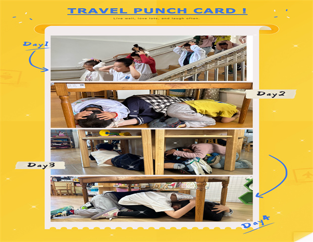 地震逃生演习是我们每一学期都要开展的,在听到警报声时,所有小朋友都快速的躲在桌子底下,听到老师喊快点排队,所有小朋友都立马抱着脑袋往楼下走。