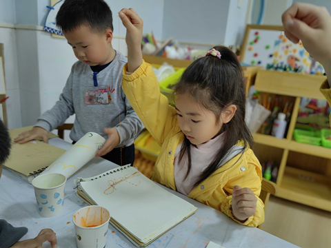 本周我们开展了一节非常有趣的美术课《抽线印画》,一根细细的毛线粘上颜料居然能画出一副好看的画,是不是非常的神奇。