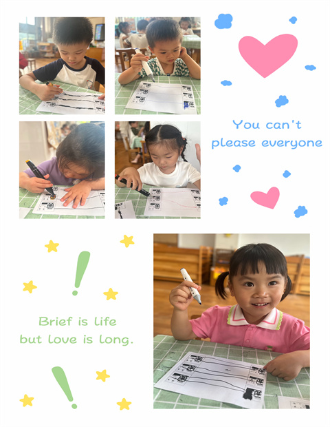 小熊火车开动咯,开过一条直直的铁道就能和小兔火车成功碰头!小朋友们的手部精细动作能力还不够强,在家要让孩子自己吃饭练习握勺子的动作,画画时要选择笔身粗的笔。