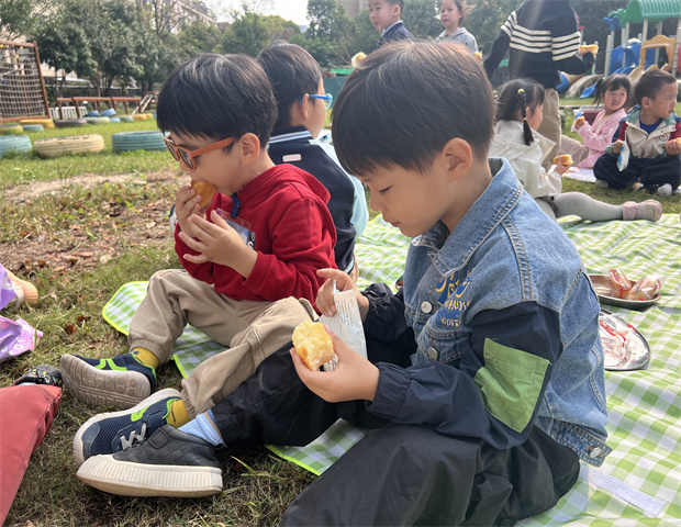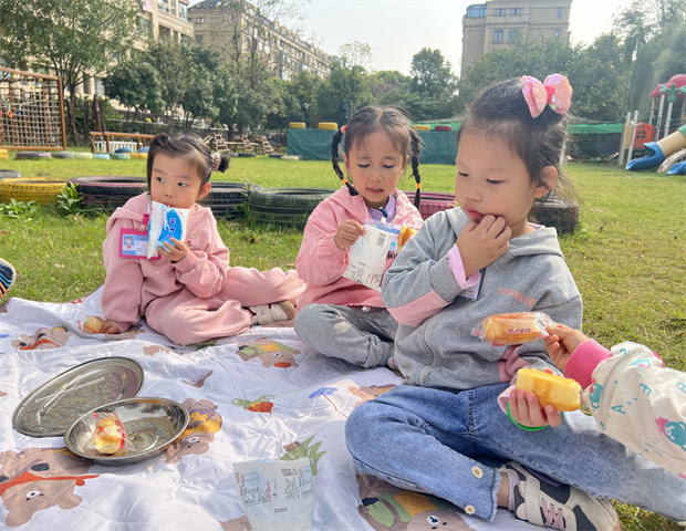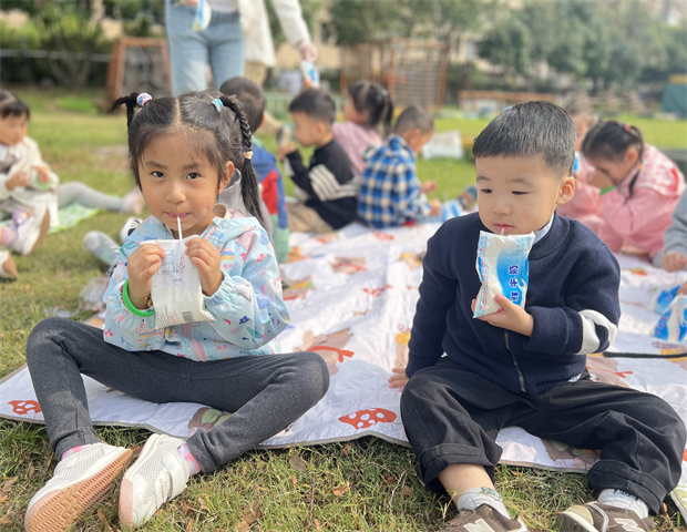 今天天气晴朗,我们一起带上野餐垫、牛奶和点心,到户外大草坪上去吃点心啦~今天的点心格外香甜哦!