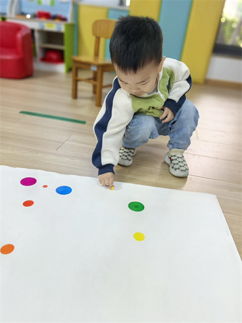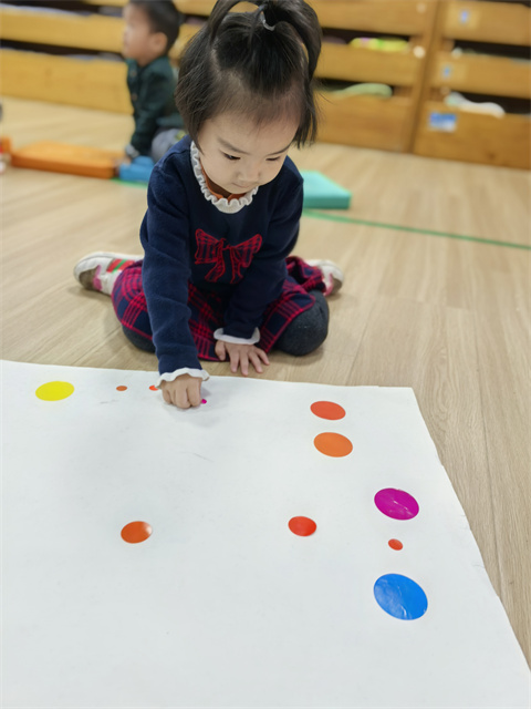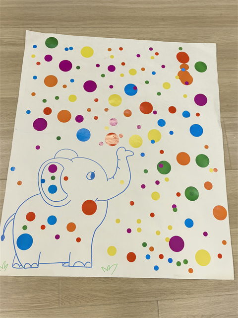 小朋友在大大的白纸上贴满了圆圆的泡泡,大家一起合作完成了一幅泡泡画。