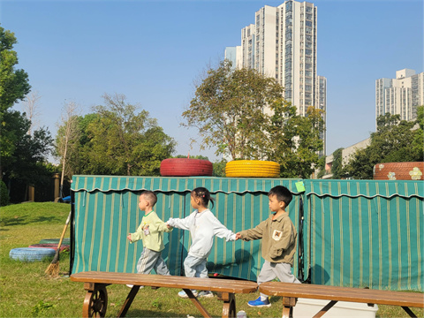 早上8点入园后,我们可以玩沙子、趣味滑滑梯、平衡桥、喂大鹅......
