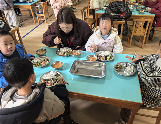 今天姜嘉甯小朋友的妈妈来园陪餐,孩子们安静午餐,给家长留下很好的印象。