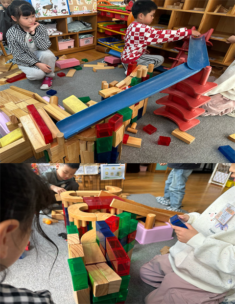 我们用建构区的积木搭建轨道斜坡,研究小球在斜坡上的滚动。