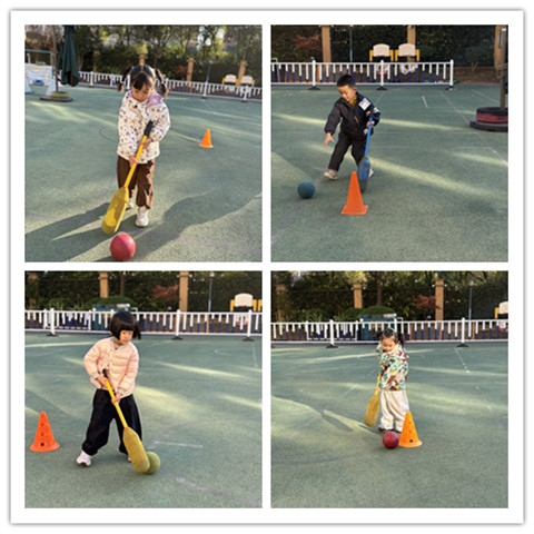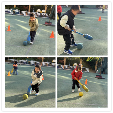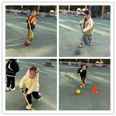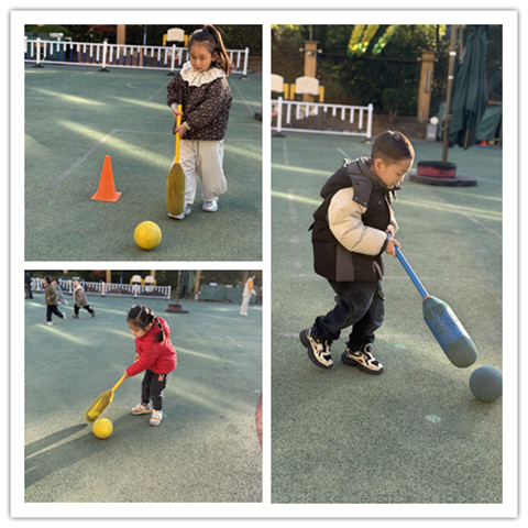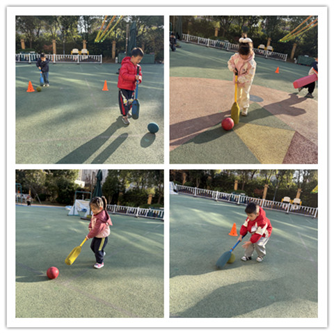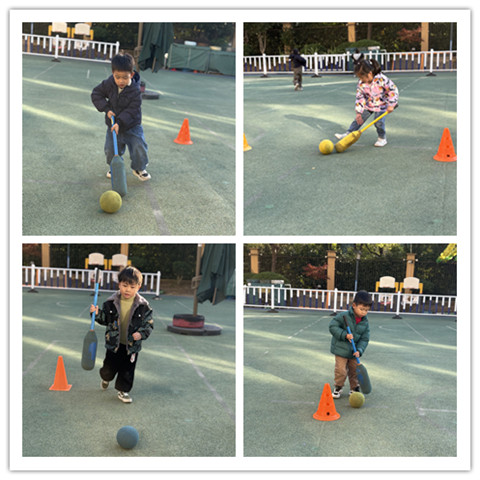 今天老师带着宝宝们一起玩了“赶小猪”的游戏,宝宝们手持棍球棒推球向前移动。在玩的过程中,有的宝宝控制不好自己的力气,球会乱跑;有的宝宝则很小心,但只能在原地打转。赶小猪的游戏生动有趣,孩子们兴致非常高。