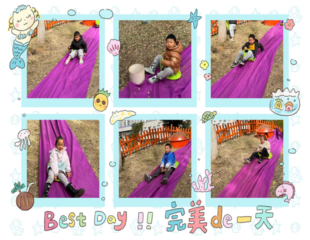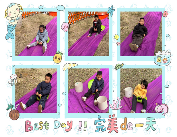 小山坡可以玩什么呢?我们铺了一个长长的垫子,小朋友们坐在垫子上,从山坡顶上滑下来,可好玩啦!