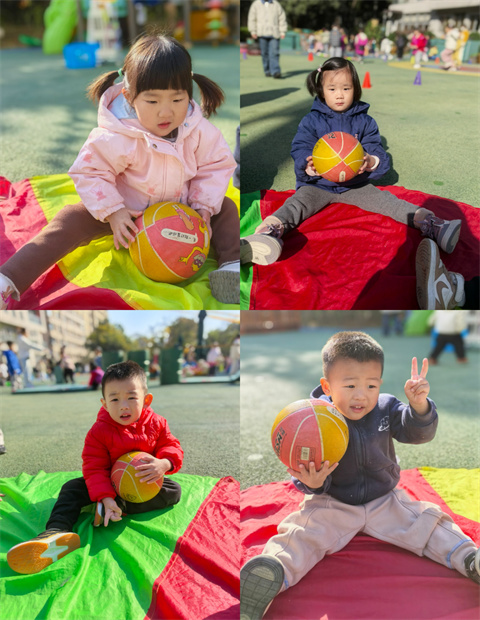 坐在彩虹伞上滚个球,快乐在指尖传递。